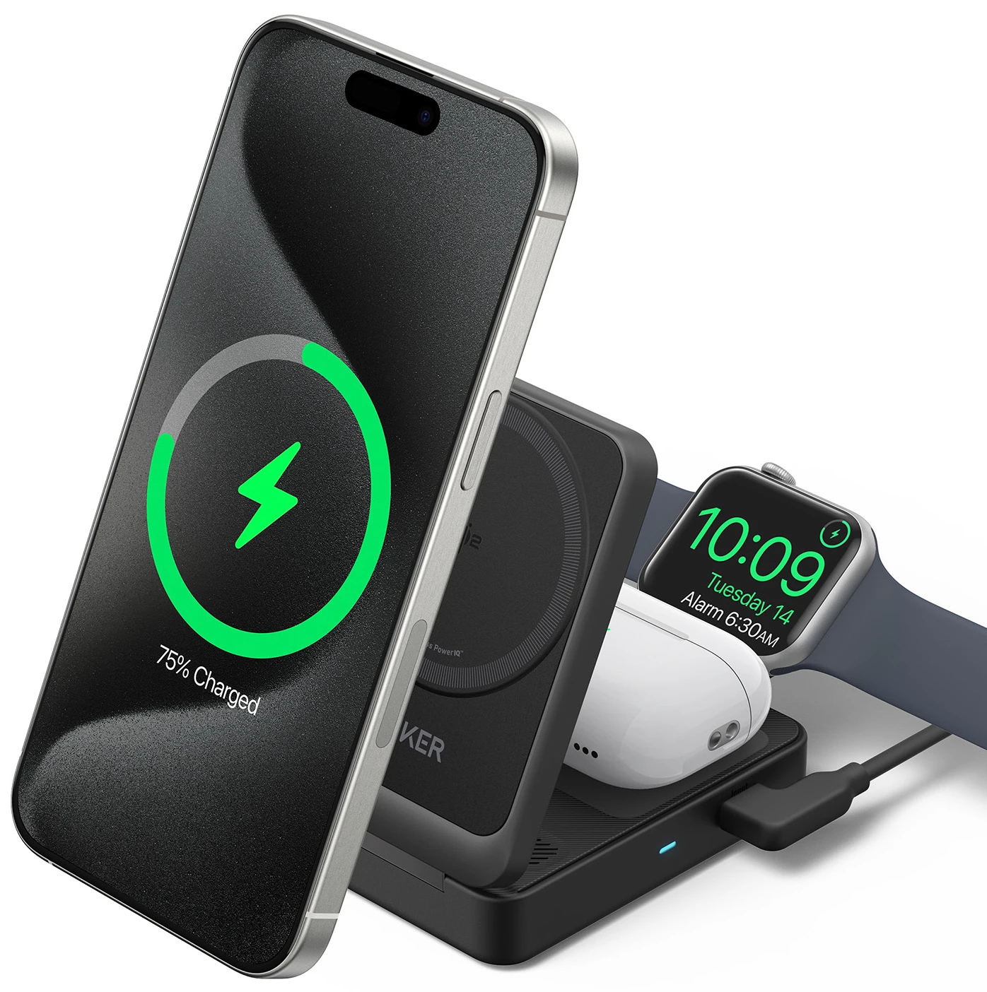3-in-1 APPLE LADEGERÄT: Lade iPhone, AirPods und Apple Watch gleichzeitig, und nutze den eingebauten, verstellbaren Handy-Ständer als Halterung.